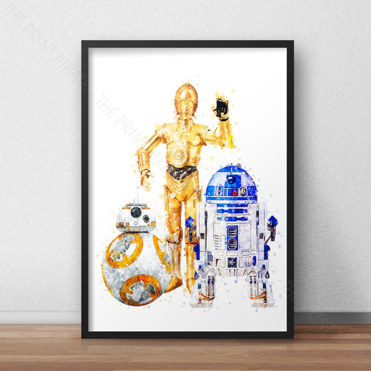 Star Wars 'R2-D2, C3PO & BB-8' Droid Watercolour Splash Wall Art Print